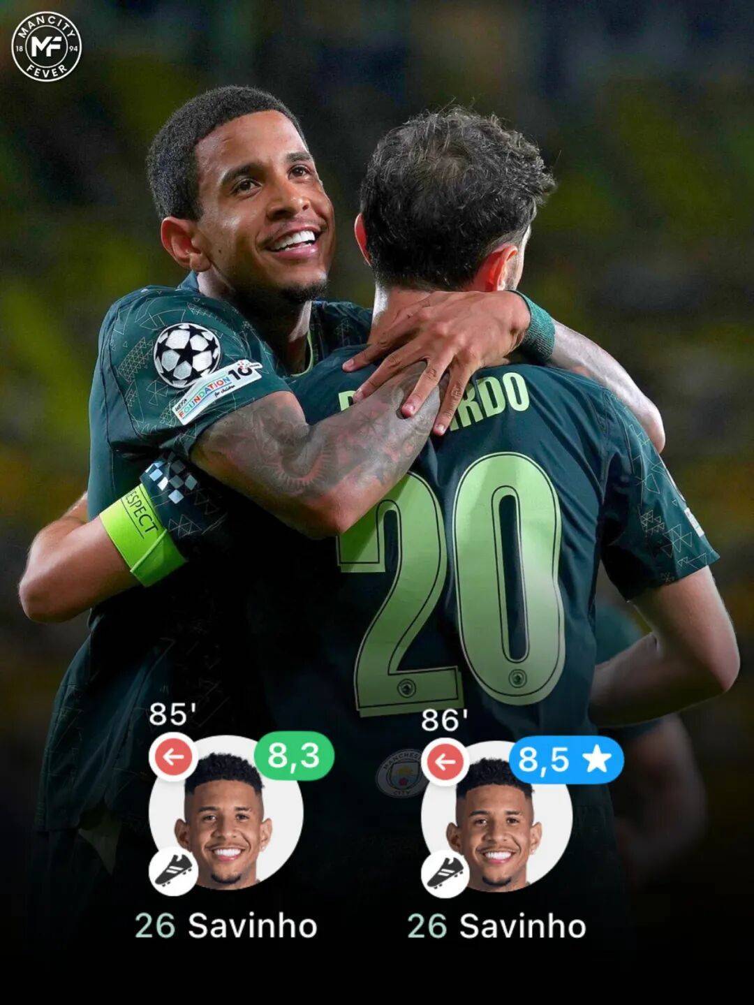 实际上,萨维尼奥的表现不止体现在助攻上。面对比利亚雷亚尔,他全场送出了5次关键传球,5次成功过人,3次创造重大机会,并完成了全部5次尝试过人,当晚只有哈兰德的射正次数多于他,这在任何比赛中都是常态。《曼彻斯特晚报》称这是他“代表曼城表现最好的比赛之一”,并给出了8/10的评分。